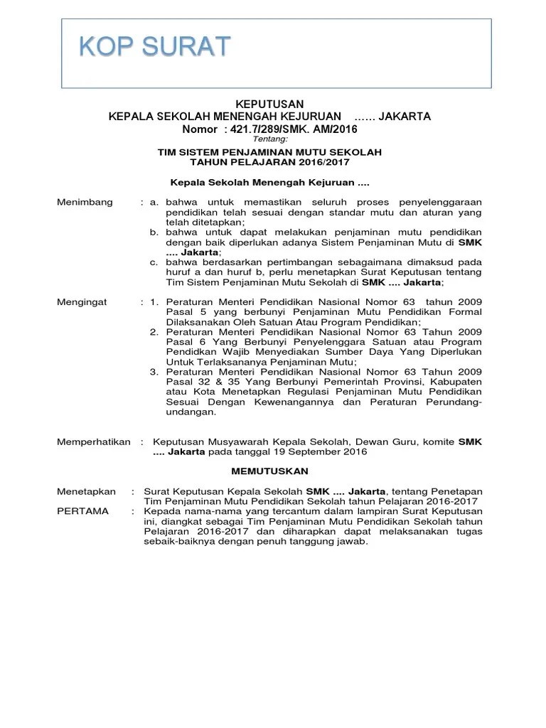 Bahwa untuk menjamin pemenuhan standar pada satuan . Adapun file yang akan saya bagikan pada postingan kali ini yaitu file format contoh sk tim penjaminan mutu pendidikan sekolah atau yang biasa di singkat sk . Download contoh surat keputusan tim satgas gugus tugas covid 19 tingkat madrasah , klik gambar atau link dibawah ini untuk donwload sk. Uraian tugas tim penjaminan mutu pendidikan sekolah (tpmps) sekolah. Business model generation · land law · barbarians at the gate · cantonese · acupuncture .